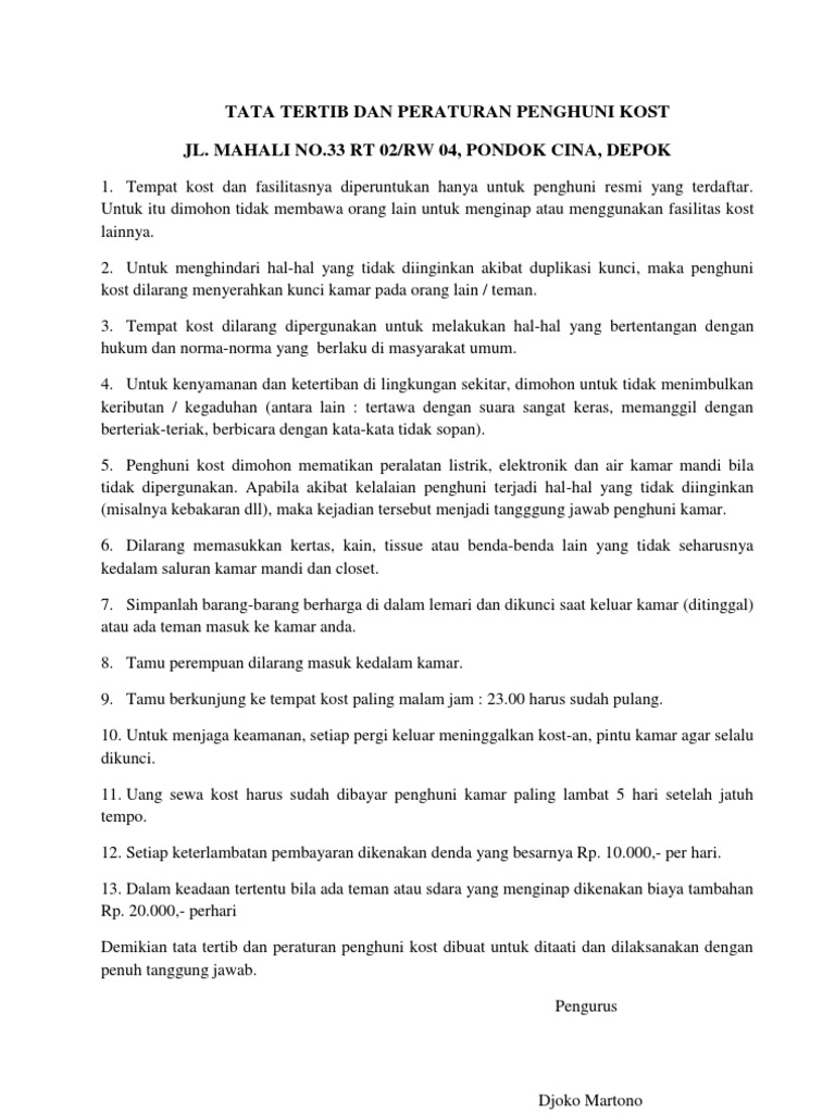 Tata Tertib Dan Peraturan Penghuni Kost Pdf